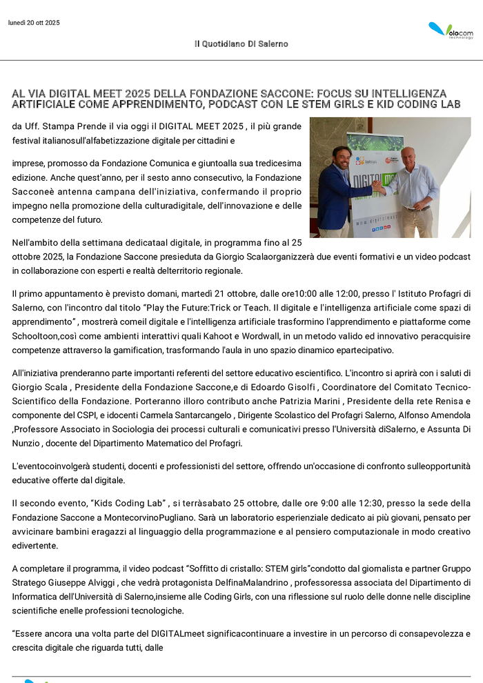 AL VIA DIGITAL MEET 2025 DELLA FONDAZIONE SACCONE FOCUS SU INTELLIGENZA ARTIFICIALE COME APPRENDIMENTO, PODCAST CON LE STEM GIRLS E KID CODING LAB